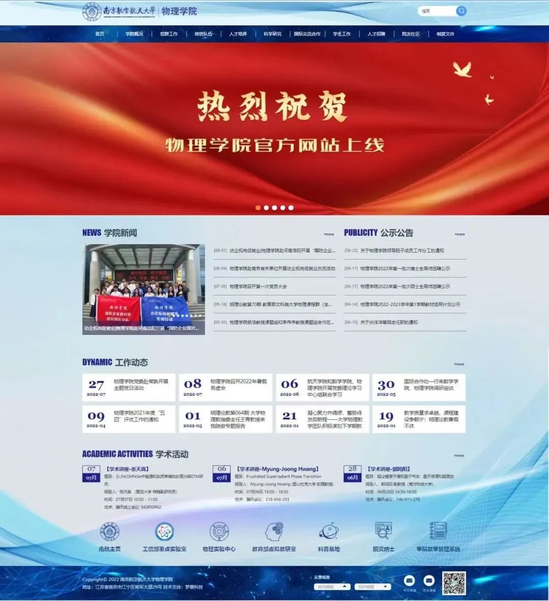 新学院,新气象。在前期充分调研和广泛征求意见的基础上,学院于6月下旬启动了官方网站的建设工作,经过几轮设计修改、编程测试及内容更新,5g影院 官方网站即日起正式运行。5g影院 官方网站主色调采用南航蓝,融入物理与空天特色。网站包含5g影院概况 、党群工作、师资队伍、人才培养、科学研究、国际交流合作、学生工作、人才招聘、院友社区和制度文件等十个栏目,全面细致地展示了5g影院 的全新的风貌。
