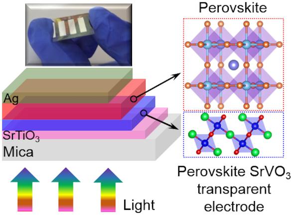因电子设备轻量化、柔性化以及便携化的发展趋势,以氧化铟锡(ITO)为代表的透明导电氧化物(TCOs)的需求日益扩大。然而,受限于铟元素的储量,需要一种新的可靠的低成本TCO薄膜。在本工作中,杨浩教授团队成功在透明柔性的云母衬底上制备出钙钛矿SrVO3透明导电薄膜,该薄膜在弯曲长达10万次后仍保持了良好的光学透明度和电导率。并进一步演示了SrVO3作为透明电极的应用:构建透明、柔性和自驱动的钙钛矿光电探测器。在没有外接电源的情况下,该光电探测器具有高响应率(42.5mAW−1)、快速响应时间(3.09/1.23ms)以及在90°弯曲角的极端弯曲角度下经过数十次循环弯曲后具有良好的性能。结果表明,低成本和结构兼容的过渡金属钙钛矿氧化物(SrVO3)作为TCO电极,在构建高性能透明、灵活和便携式智能电子产品方面具有巨大潜力。