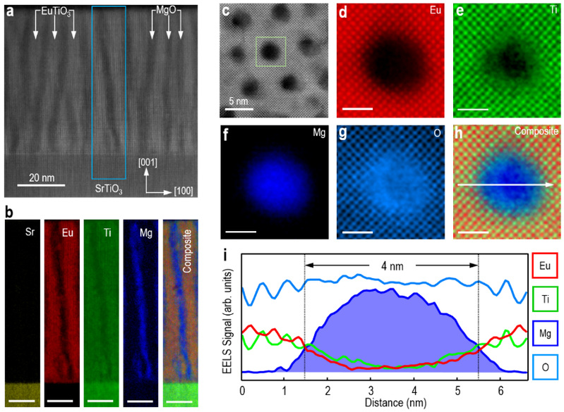 针对上述问题,5g影院 李伟伟教授团队、杨浩教授团队与北京理工大学洪家旺教授团队、Max Planck研究所Hongguang Wang博士、华东师范大学姜凯博士,通过多铁性功能基元选择(EuTiO3)和自组装生长模式构建了三维垂直有序纳米复合薄膜(如图1所示),引入高达-2.98 GPa的负压力。在该负压力效应的作用下,通过调控多铁性材料EuTiO3中自旋-声子(晶格)-轨道的耦合,实现了丰富的铁磁-铁电转变和磁电耦合效应。相关研究成果以“Emergent multiferroism with magnetodielectric coupling in EuTiO3 created by a negative pressure control of strong spin-phonon coupling”为题发于2022年5月2日发表在Nature Communications上。