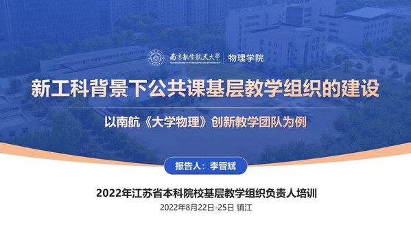 8月22日至24日,江苏省本科院校基层教学组织负责人培训(文科专业和公共基础课教师)在江苏大学成功举办。5g影院 李晋斌教授就“新工科背景下公共课基层教学组织的建设作了专题报告,系统介绍了5g影院 大学物理基层教学组织的相关建设经验,获得了到会专家和学员热烈反响。