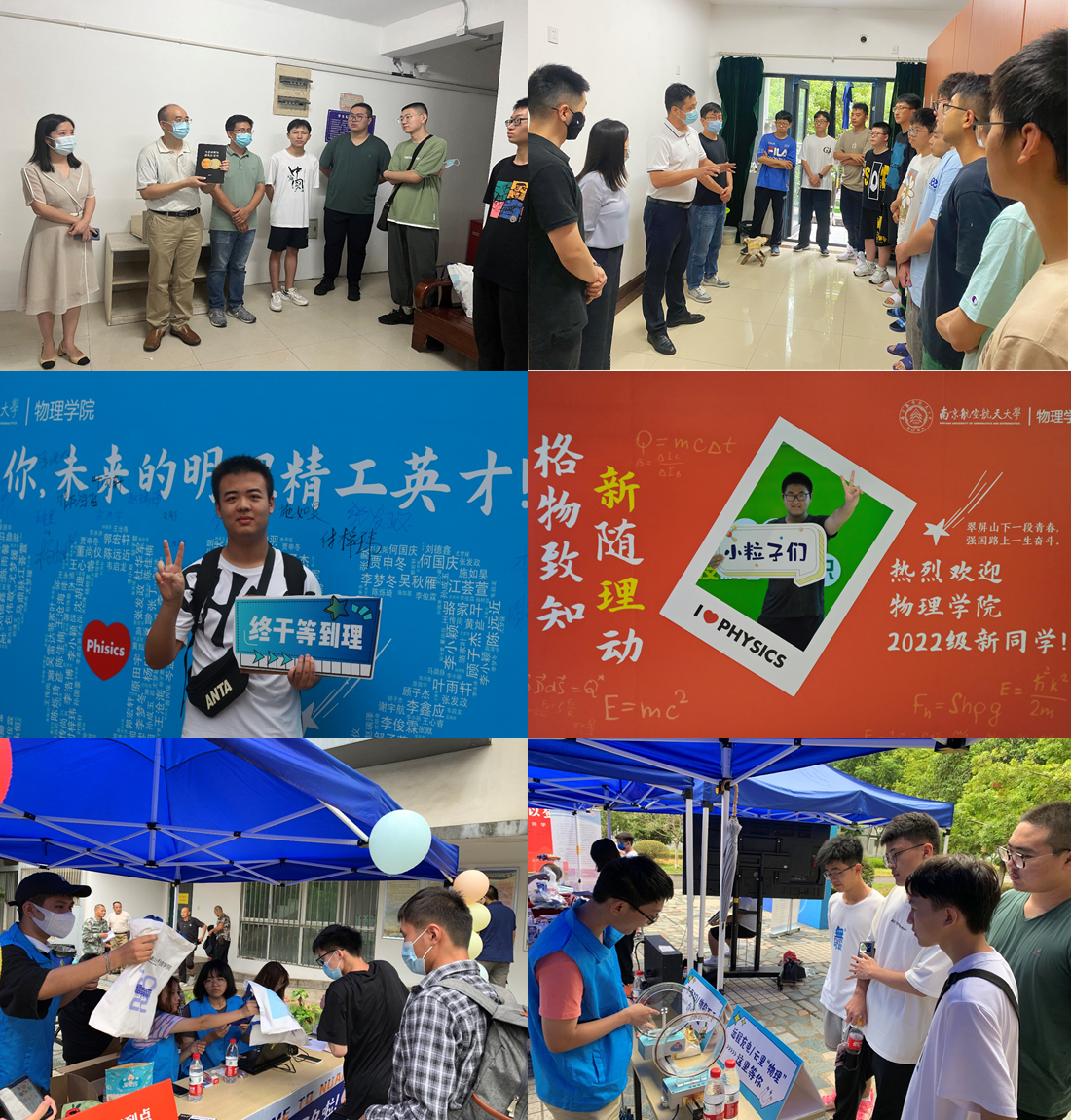 开放日的首个打卡点是院训墙,学院院长刘友文教授向新生介绍了学院院徽和院训的内涵。刘院长从院徽中的“格”字讲起,介绍了学科从上世纪“格物学”到本世纪“物理学”的历史沿革脉络以及未来发展前景,同时以院徽的南航蓝底色引出了南航物理学科的国防背景。刘院长在讲解院训“明德、明理、明心”的来历时,重点介绍了院训所蕴含的“培根铸魂、启智润心”之意。院训墙一侧是学院名师海报,刘院长一一进行了介绍并鼓励新生多到学院楼与老师们进行交流。