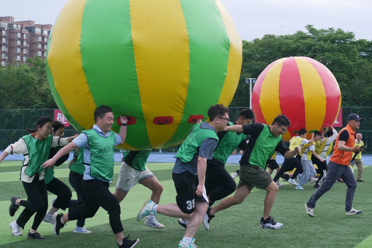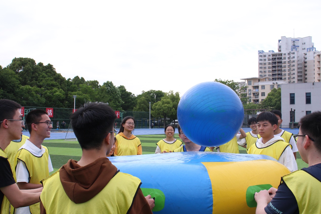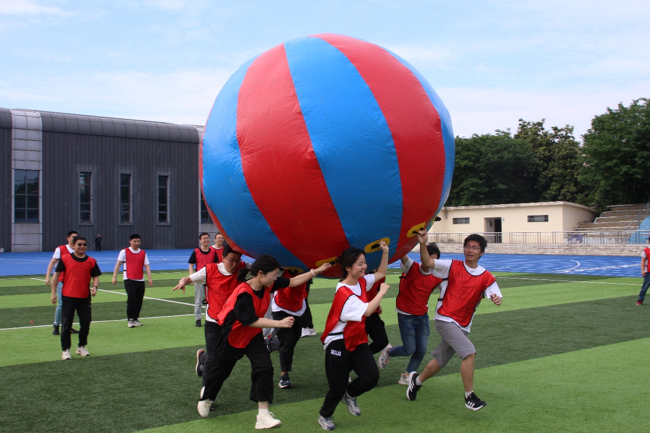 在“厚德载物 运转乾坤”项目中,四支代表队的选手们各自8名队员分工合作,努力配合,在听到哨声的一刹,合理扛着“乾坤球”在跑道上冲刺接力。在烈日照耀下,大家不畏艰辛,都在努力为团队争夺分数,越过终点线时的喜悦洋溢于脸上。