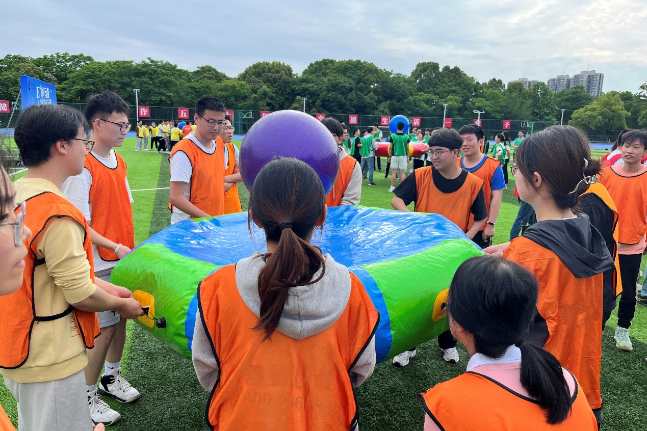 在最激动人心的“团结一心 力拔山河”项目中,场上加油助威声此起彼伏。对于各个团队而言,拔河无疑是最激动人心的,粗长的绳子凝聚的不仅是场上队员的力量,更是场下各代表队老师与学生的信任。在一阵又一阵的加油声中,现场热烈气氛不断升温,师生们眼神坚定、方向相同、齐心协力共同迎战对手。参赛师生尽情挥洒气力,乐在其中。