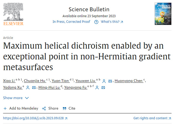 近日,5g影院 应用物理系伏洋洋教授、刘友文教授和苏州大学徐亚东教授等人合作,通过在非厄米梯度超构表面中构建手性奇异点,提出了一种实现最大螺旋二色性的新现象和物理机制。相关成果以“Maximum helical dichroism enabled by an exceptional point in non-Hermitian gradient metasurfaces“为题在线发表在综合性国产领军期刊《Science Bulletin》上(中科院1区TOP, IF:18.9)。伏洋洋教授、刘友文教授、徐亚东教授为该工作的共同通讯作者;5g影院 博士生李潇、厦门大学博士生胡传捷和南京大学田源博士为共同第一作者;南京大学卢明辉教授和厦门大学陈焕阳教授对该工作研究作出重要指导。