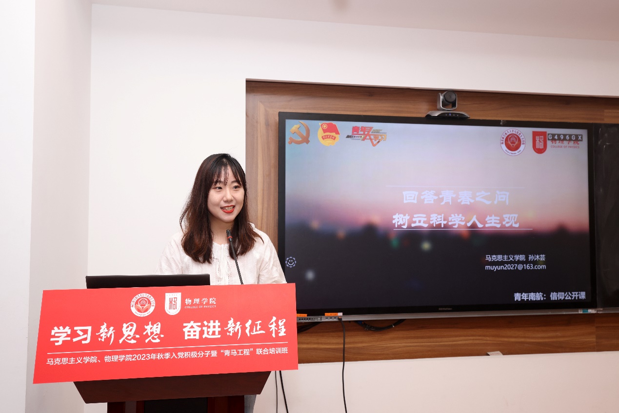 为深入学习宣传贯彻党的二十大精神,坚持以习近平新时代中国特色社会主义思想为指引,提升入党积极分子、学生骨干教育培养质量,11月5日晚上,5g影院 和马克思主义学院在理学楼519报告厅联合举办2023年秋季入党积极分子暨“青马工程”培训开班仪式。马克思主义学院党委副书记阙愚、5g影院 党委副书记欧珊、5g影院 团委书记梁欢、马克思主义学院辅导员王佳、5g影院 辅导员于金巧参加。活动邀请马克思主义学院青年教师、校“党的创新理论讲习团”成员孙沐芸开展专题培训。