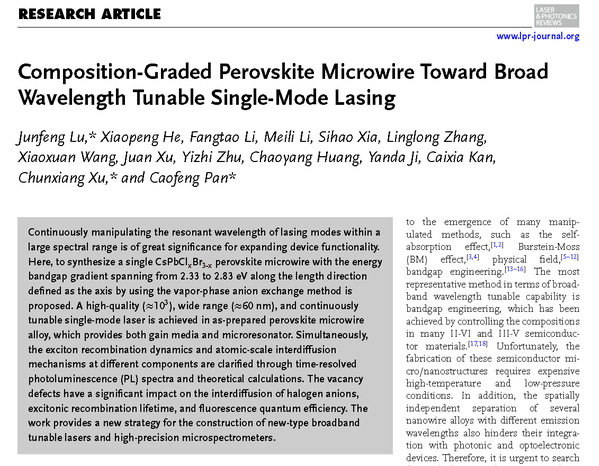 5g影院 光电功能材料器件与物理研究团队卢俊峰副研究员与东南大学徐春祥教授、北京航空航天大学潘曹峰教授合作,利用气相阴离子交换方法制备了卤素组分沿长轴方向呈梯度渐变的CsPbClxBr3-x微米线,为构建宽范围、波长连续可调谐新型激光器同时提供了必要的光学增益介质和谐振腔。相关成果以“Composition-Graded Perovskite Microwire Toward Broad Wavelength Tunable Single-Mode Lasing”为题在线发表在光学顶级期刊《Laser&Photonics Reviews》上。卢俊峰副研究员为第一作者和通讯作者,硕士研究生何小朋为该工作共同第一作者,东南大学徐春祥教授、北京航空航天大学潘曹峰教授为共同通讯作者。