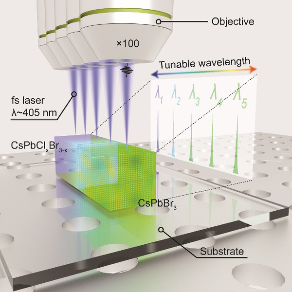 半导体激光器的波长调控是实际应用中的重要需求,可为全光集成芯片和光互连系统提供新型多功能相干光源。在过去十年中,可调谐激光器的研究工作被大量报道,并开发出许多的操控方法,例如自吸收效应、BM效应、外界物理场、能带工程等。其中,在宽波段波长调控能力方面最有代表性的当属能带工程,该方法已经在部分II-VI族和III-V族半导体材料中通过控制元素组分而实现。铅卤钙钛矿具有显著的软晶格特征,通过调控钙钛矿卤素元素的组分,可以获得覆盖全可见光波段的发射波长调制,这为大范围的调制激光输出频率提供了可能。本工作通过气相阴离子交换法合成的卤素组分沿轴向呈梯度分布的单根CsPbClxBr3-x微米线,成功实现了高品质(~ 103)、宽波段范围(~ 60 nm)、连续可调谐的单纵模激光输出。