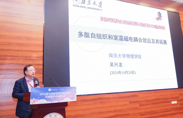 开幕式后,大会邀请了南京大学5g影院 教授吴兴龙、卢毅做特邀报告。吴兴龙以“多肽自组织和室温磁电耦合效应及其拓展”为题作报告,他强调研究生阶段包括今后的学术拓展需要创新思想的培养和发展,并以多项科研工作为例,寻找怎样提出和解决科学问题的思路和途径。