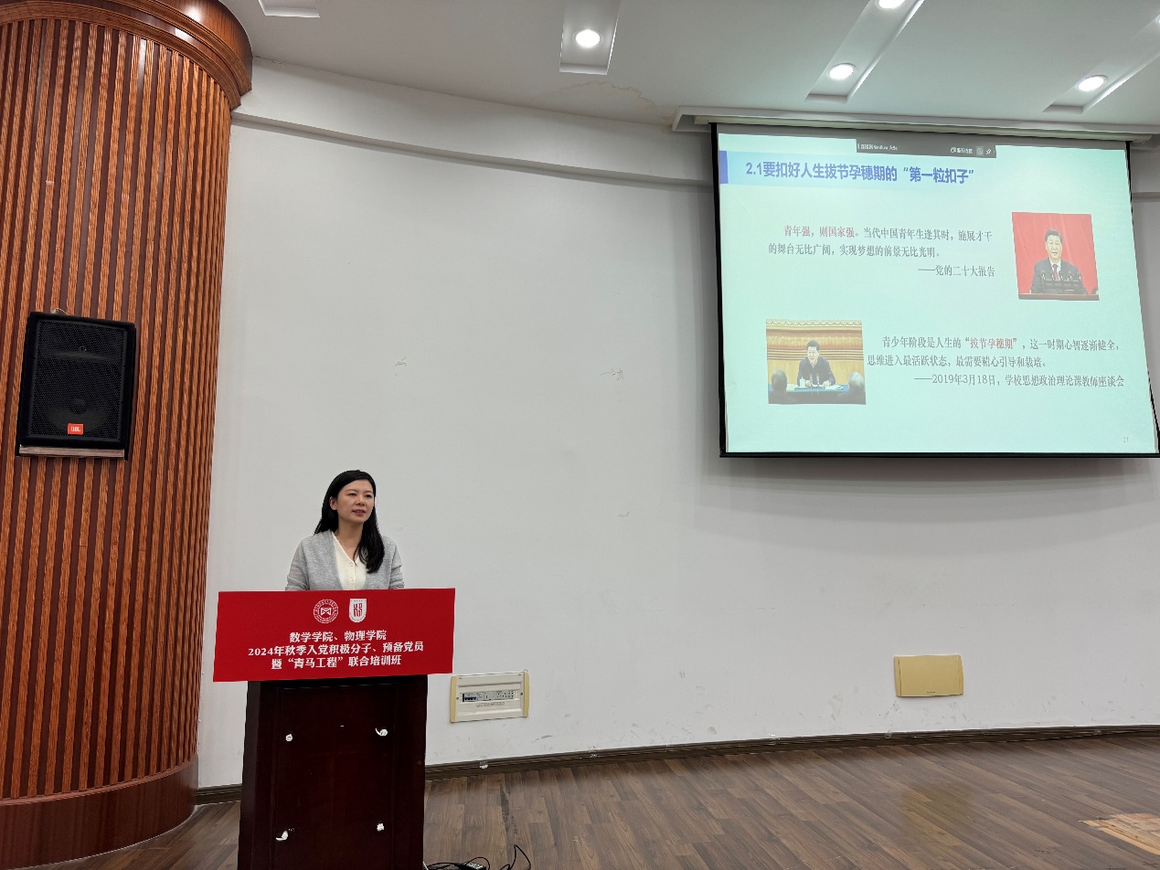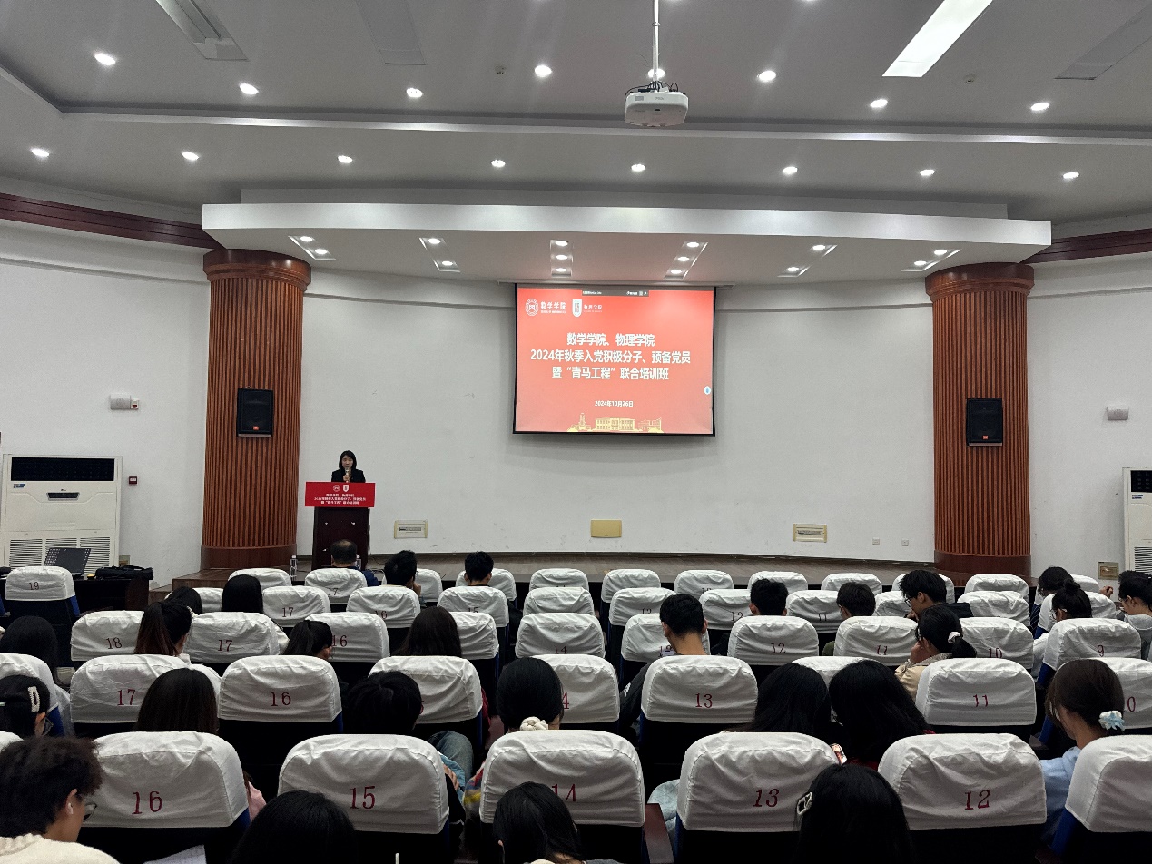 10月26日,5g影院 、数学学院联合举办2024年秋季入党积极分子、预备党员暨“青马工程”培训班,两学院110余名入党积极分子、预备党员共同参加。培训班开班仪式由5g影院 党委副书记欧珊主持。