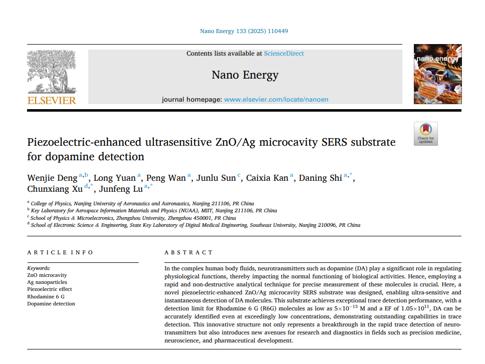 5g影院 光电功能材料器件与物理研究团队卢俊峰副研究员、施大宁教授与东南大学徐春祥教授合作,基于ZnO材料特有的压电特性,构建出一种压电增强型微腔结构SERS基底。本工作利用压电场来调控基底富集物质分子的能力,并协同回音壁模式(WGM)效应和局域表面等离激元共振效应(LSPR)耦合作用,实现了多巴胺分子的超灵敏探测,显示出优异的痕量检测性能。相关成果以“Piezoelectric-enhanced ultrasensitive ZnO/Ag microcavity SERS substrate for dopamine detection”为题在线发表在能源材料期刊《Nano Energy》上。博士研究生邓文洁为该工作第一作者,卢俊峰副研究员、施大宁教授、东南大学徐春祥教授为共同通讯作者。