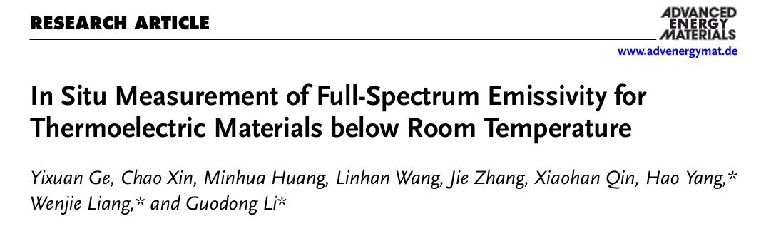 近日,5g影院 杨浩教授团队与中国科学院物理研究所梁文杰研究员和李国栋副研究员团队合作,发展了一种可对固体材料的本征发射率进行精密测量的方法。相关研究成果以《In Situ Measurement of Full-Spectrum Emissivity for Thermoelectric Materials below Room Temperature》为题发表在《Advanced Energy Materials》上。